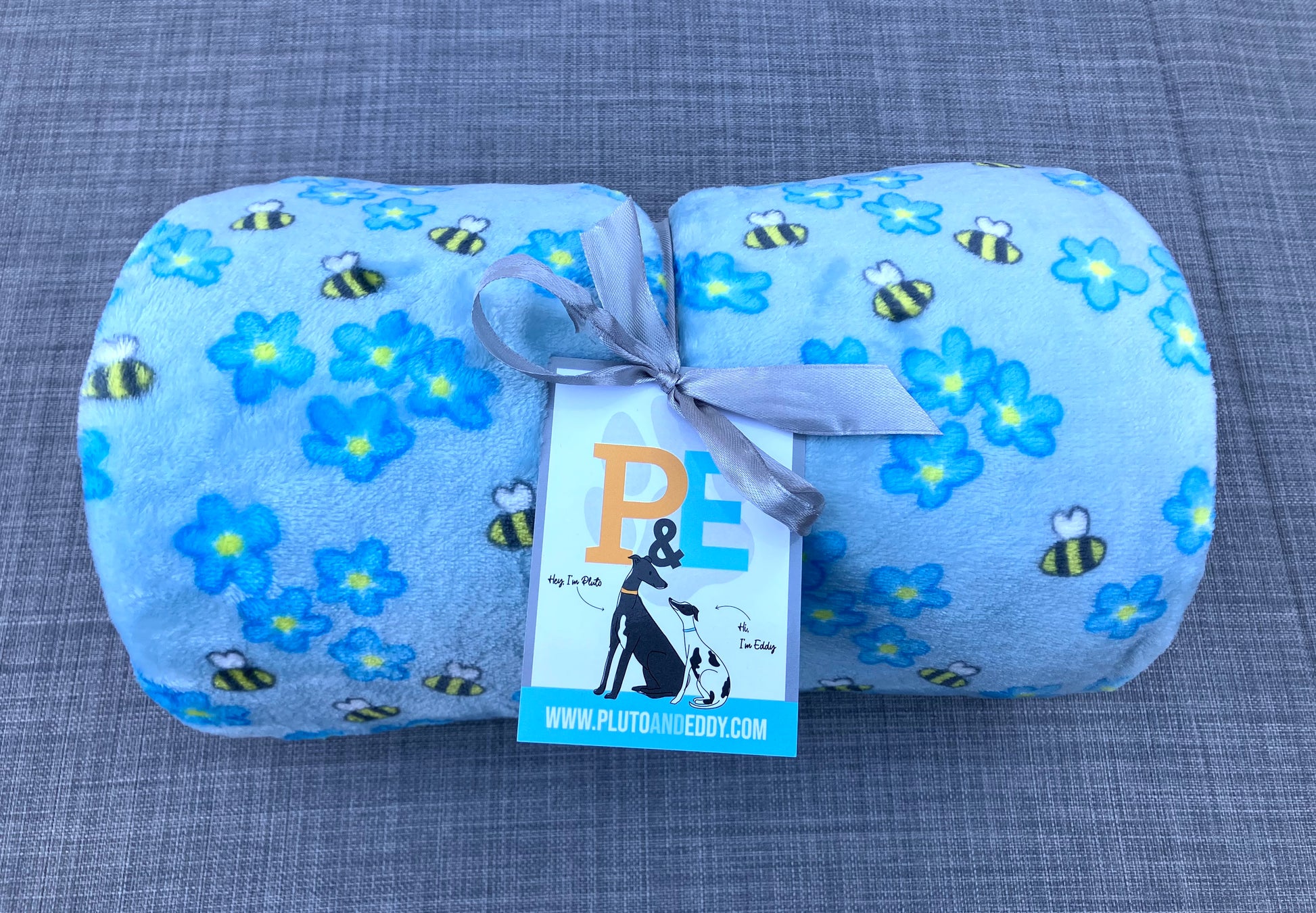 This light blue cosy blanket is illustrated with bees and forget-me-not flowers on repeat pattern. Delivered rolled and tied with grey ribbon and finished with a P&E tag.