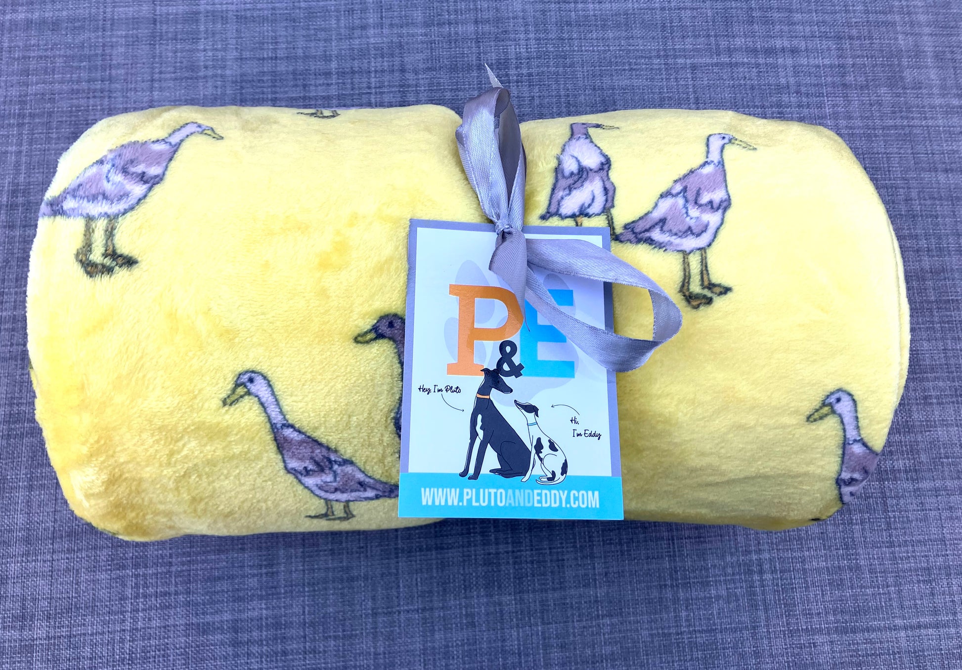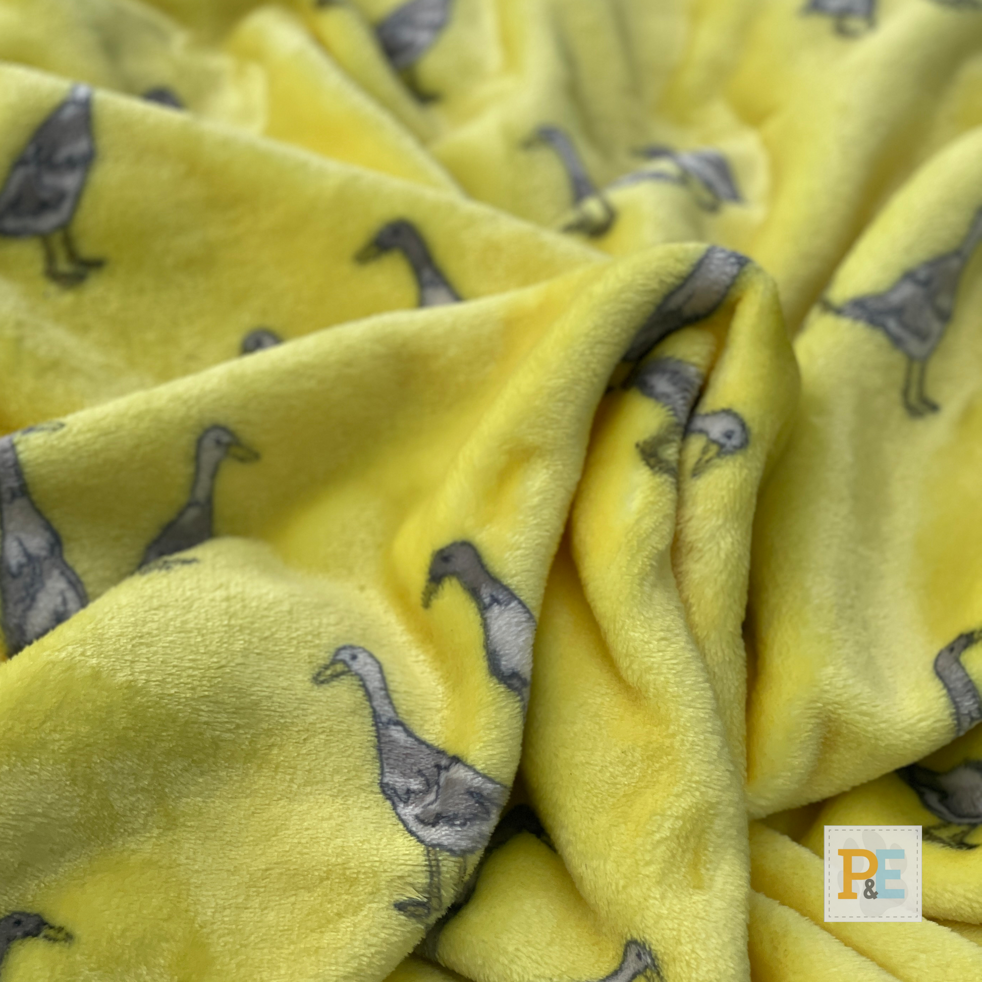 This bright yellow blanket is illustrated with light and dark brown ducks on repeat pattern.